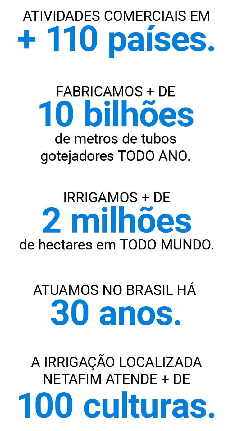 Por meio dos sistemas de irrigação por gotejamento ou por aspersão, a Netafim oferece a solução adequada para todas as necessidades, desde pequenas propriedades até grandes fazendas comerciais, levando água e nutrientes às raízes das plantas, garantindo um crescimento saudável e maior produtividade.
